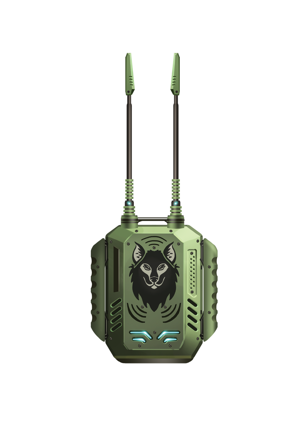Antenne sur le côté du casque, antennes dans le dos de l'armure.
