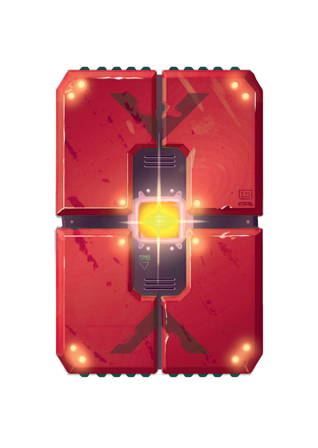 C’est pour protéger les chevaliers au contact que ce bouclier carré a été créé. Quatre panneaux amovibles aux bords dentés démultiplient sa surface de couverture et sa dangerosité. Au centre, une charge explosive directionnelle à usage unique permet de balayer l’adversité. Pour l’utiliser, il vaut mieux planter le bouclier au sol. Si le sol est en béton, le chevalier doit frapper plus fort !