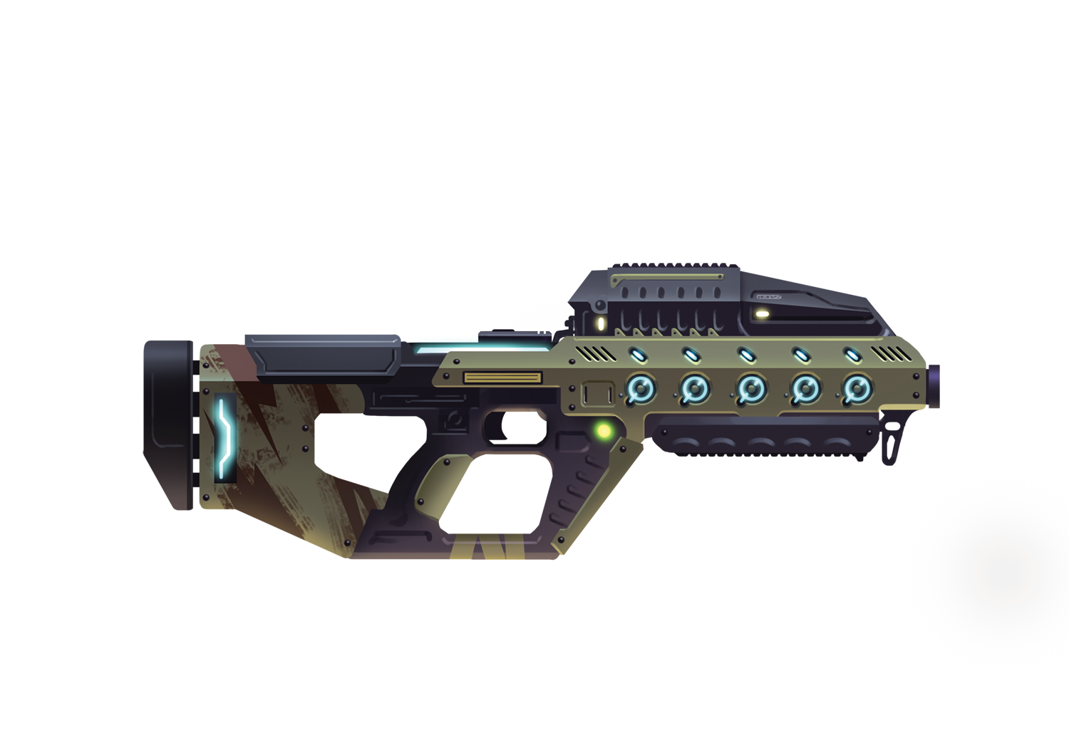 Cette arme est un émetteur de rayons à lumière cohérente portatif. Bref, un fusil laser. L’arme consomme trop d’électricité pour que les chevaliers puissent la faire tourner sur batteries. En conséquence, chaque tir puise sur le réacteur à énergie alpha de l’armure. On peut augmenter l’intensité du rayon, au prix d’une dépense énergétique proportionnelle. Le laser est bleu et invisible par temps clair. Mais, s’il y a de la poussière dans l’air ou qu’on est dans une zone de ténèbres, on ne peut pas le rater.