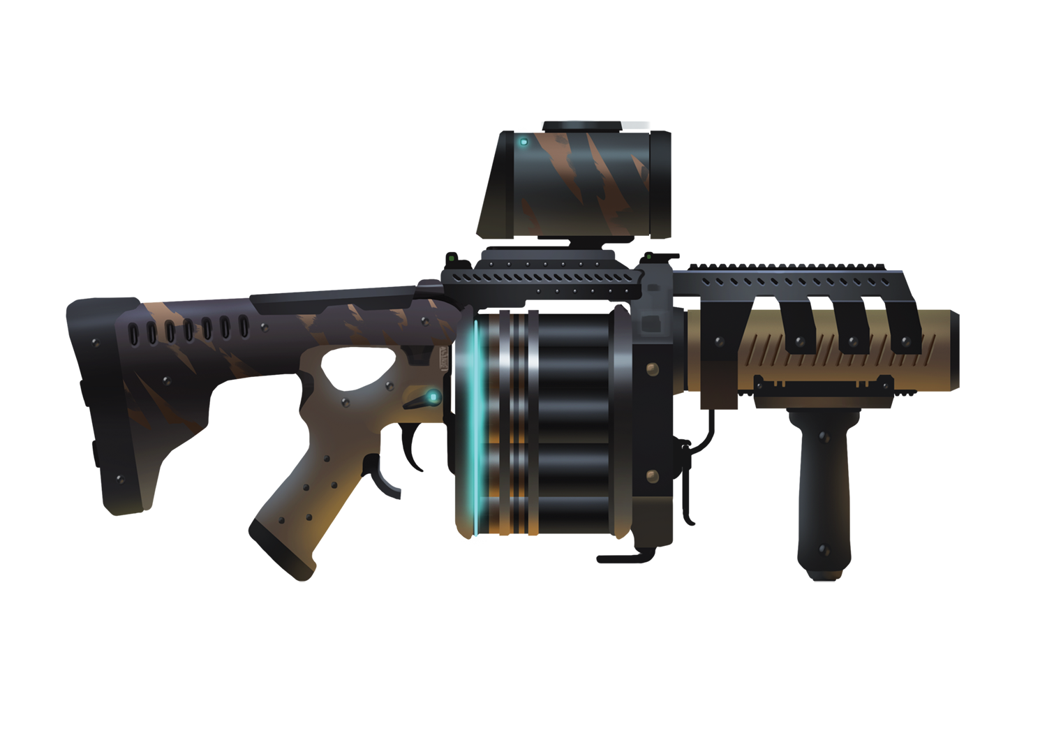Ce lance-grenade semi-automatique lourd donne à un chevalier la puissance d’une petite section d’artillerie. Il est alimenté par un chargeur revolver automatisé contenant 24 grenades 40mm haute vélocité. Ce chargeur arme le type de grenade qu’on lui demande d’un simple mot prononcé à voix haute.