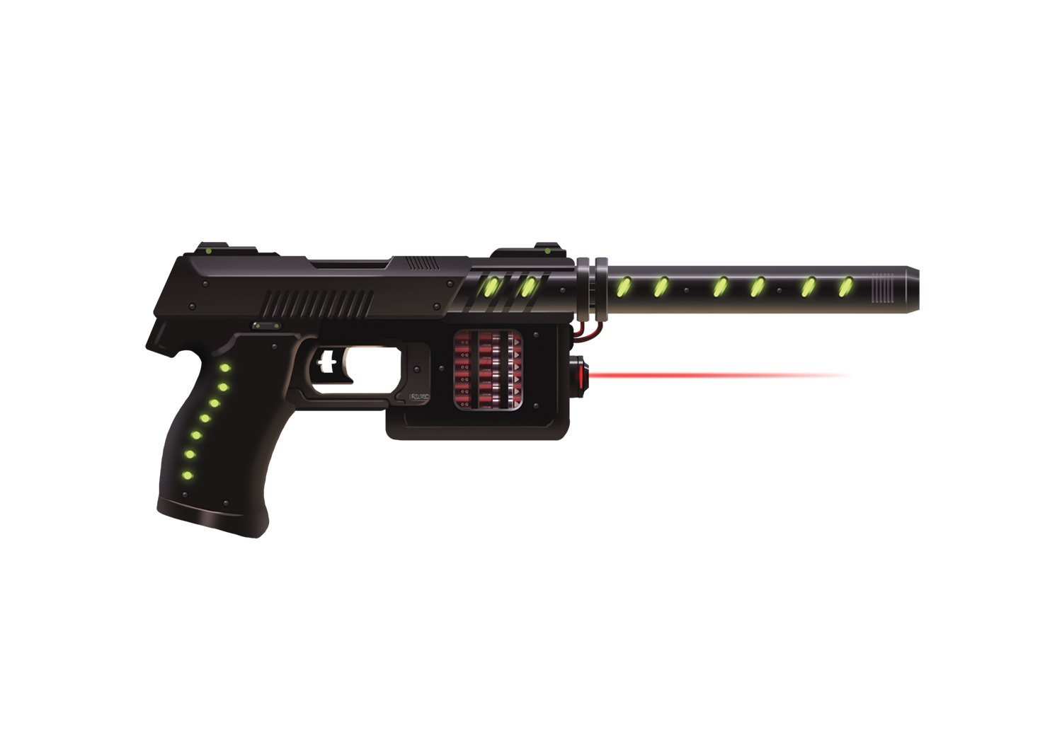 Ce pistolet d’infiltration compact et silencieux propulse des fléchettes blindées conçues pour traverser les armures et les blindages légers. Une fois dans le corps de la cible, elles relâchent une substance qui peut être une neurotoxine, un sédatif ou des nanomachines destructrices. C’est donc l’arme idéale pour un assaut discret. Les trois types de chargeurs sont marqués ainsi : neuro, choc et nano, avec code couleur. Au chevalier de choisir le type de munition qui correspond le mieux à la situation.