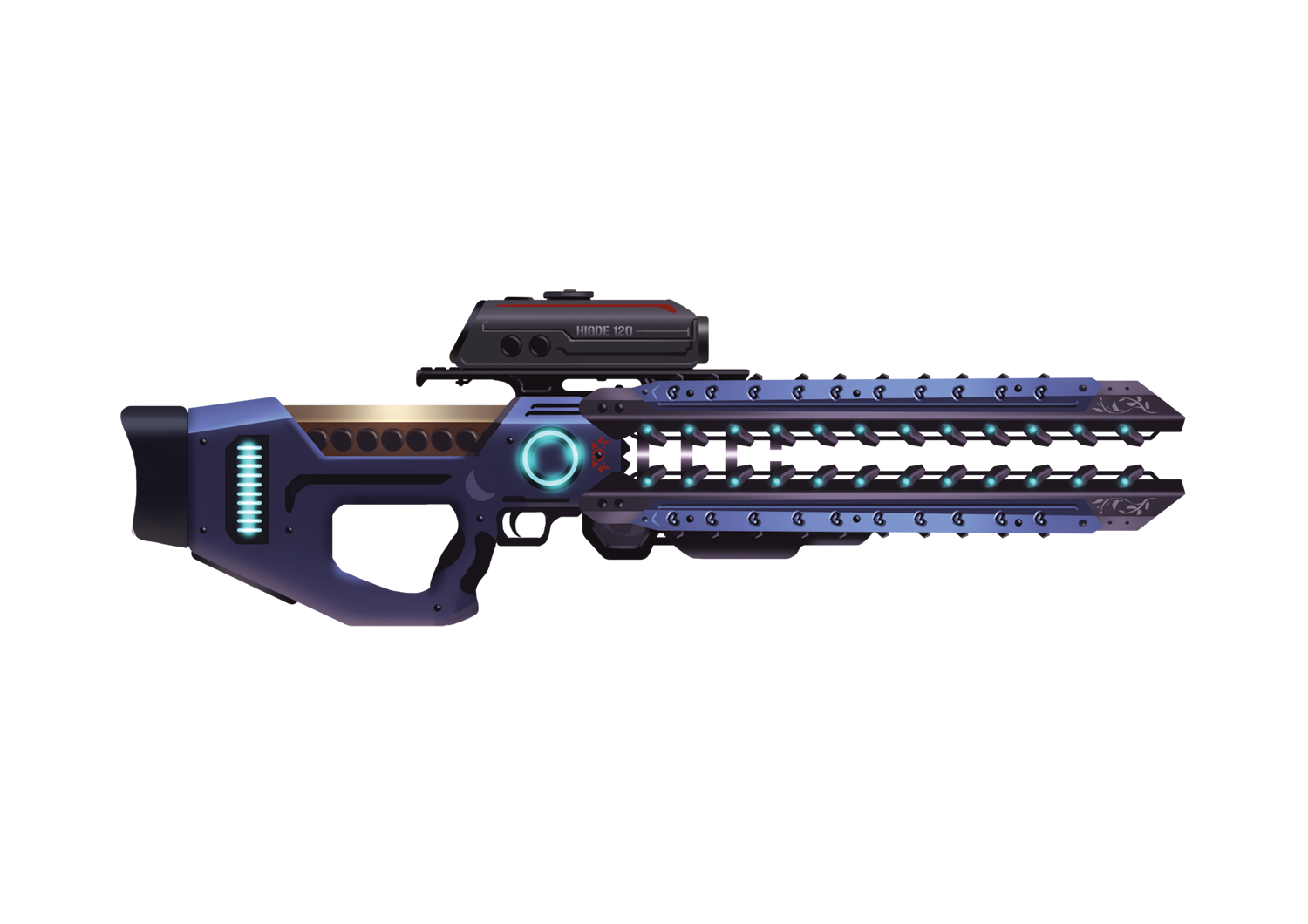 Le railgun est un fusil à canon électrique utilisant la force magnétique pour propulser des balles à une vitesse extrême grâce à des batteries et des circuits d’énergie alpha placés dans la crosse. À 3 500 mètres par seconde, la balle du railgun porte en elle une énergie cinétique phénoménale qui lui fait traverser les bâtiments et les véhicules sans aucun souci. Les cibles sont transpercées, qu’elles soient organiques, mécaniques, à couvert ou blindées n’y change rien. Le railgun dispose, bien entendu, d’une lunette de visée et d’une caméra très haute définition pour désigner des cibles et tirer à plusieurs kilomètres de distance.